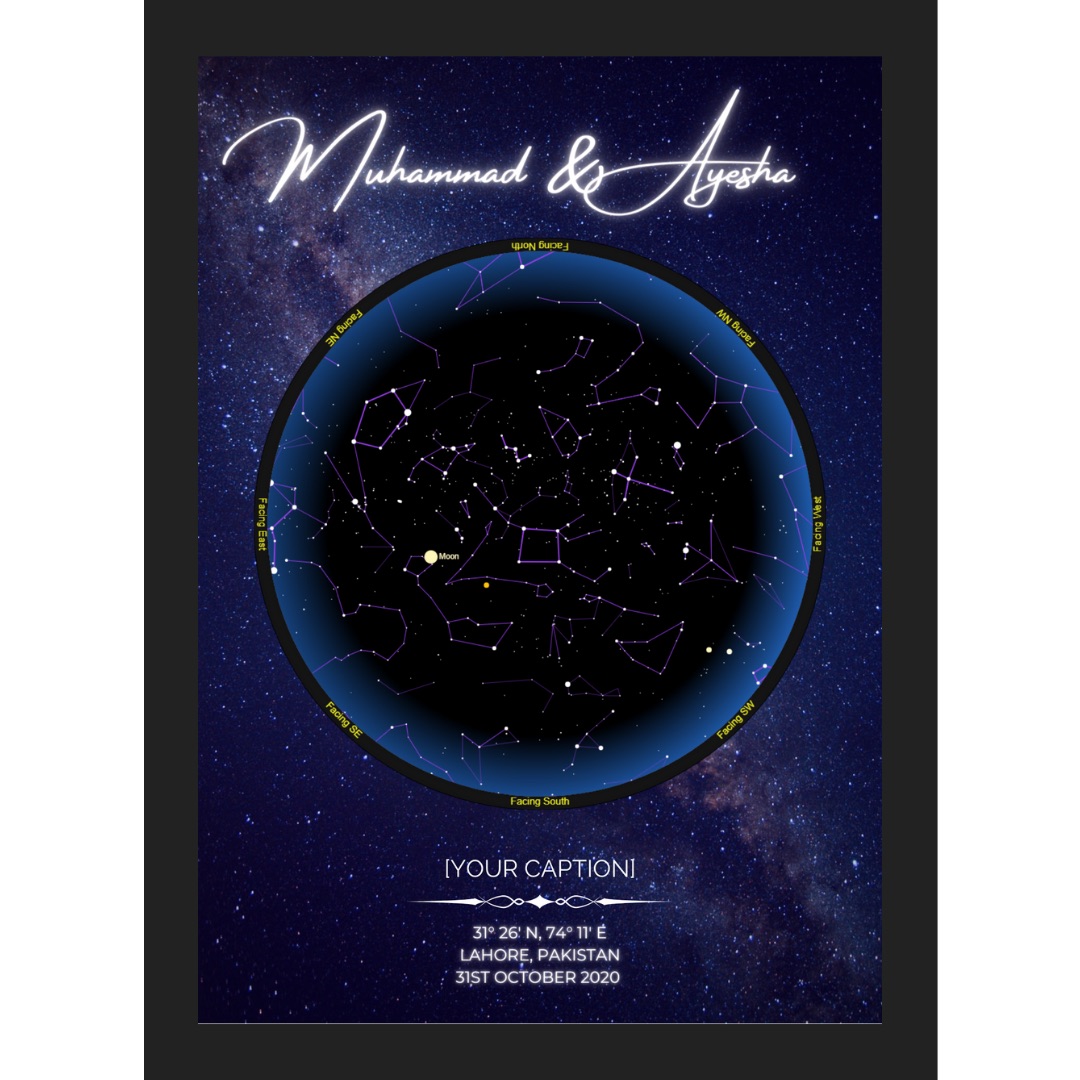 Simply provide us with the date and location of the event along with any other personalisation you would like i.e. names or greetings. We will use our expert astronomical databases and catalogues from where we use an AI exclusive access software to pinpoint the night sky on that specific date/moment. We issue a guarantee of authenticity with every Star Map that Sheen Jeem commissions.