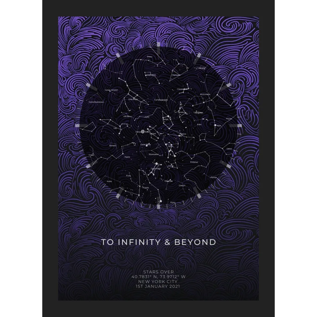 Crafted with creativity, the violet star map alignments are set against a swirling backdrop of royal violet and dark hues, offering a quirky take on the intricacies of the celestial artwork.