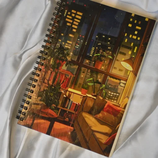 This journal features a cozy living room overlooking a twinkling cityscape at night. Perfect for jotting down thoughts, dreams, or stories inspired by the calm of the night and the buzz of the city.
