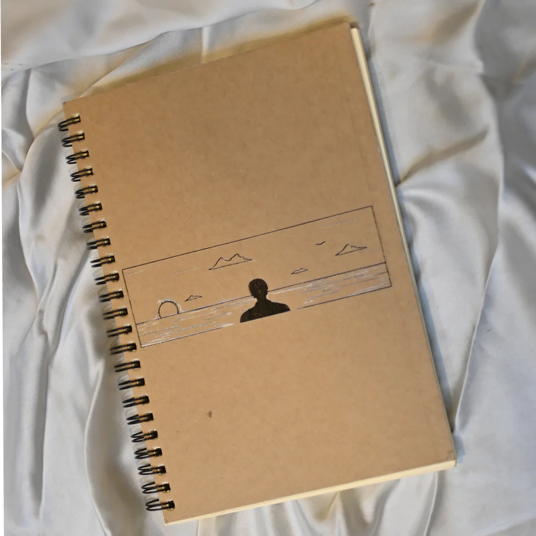 This spiral-bound journal features a minimalist design with a unique cutout on its kraft paper cover. Resting on soft white fabric, it’s perfect for capturing thoughts and sketches in a calm, creative space.